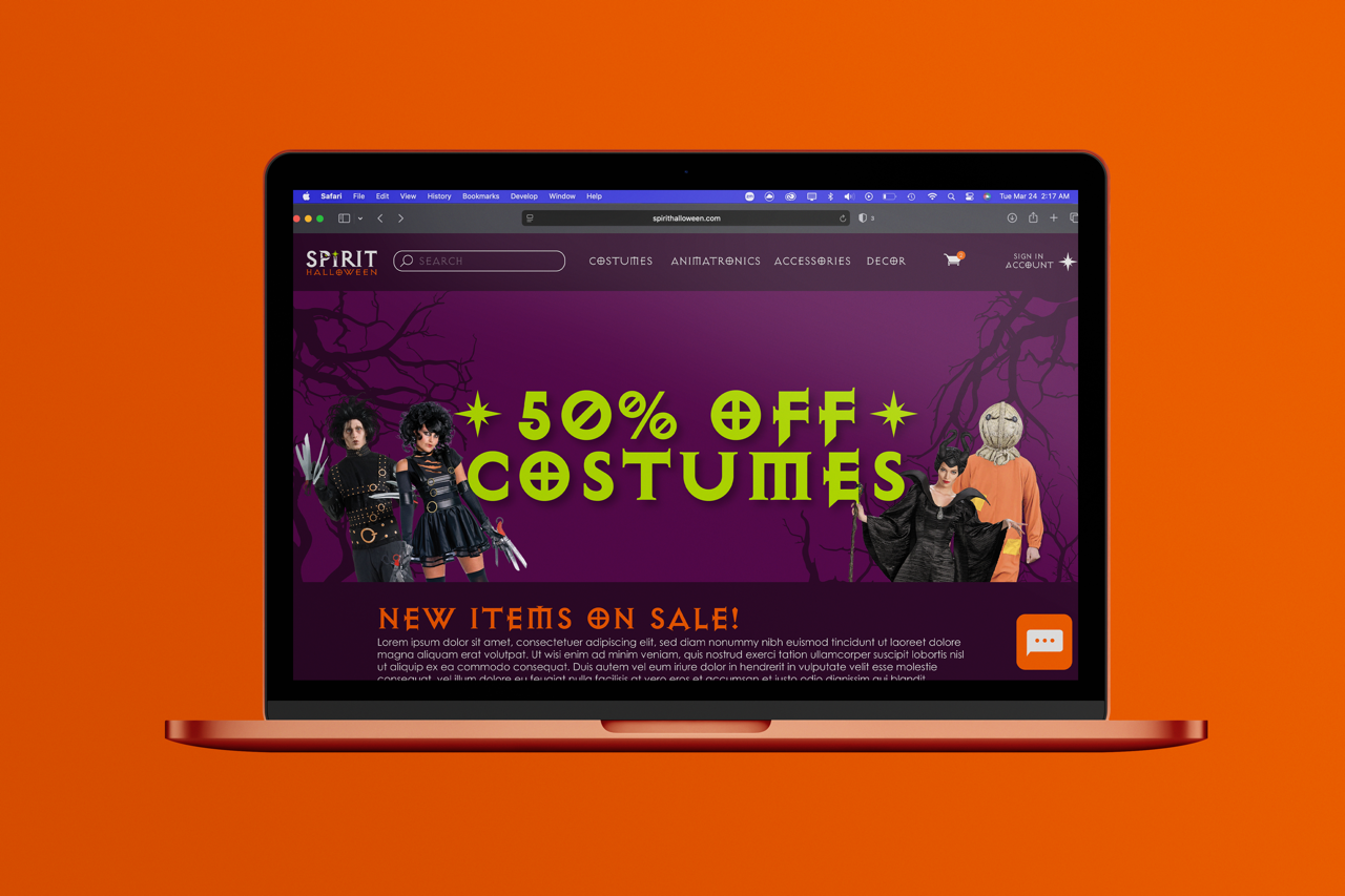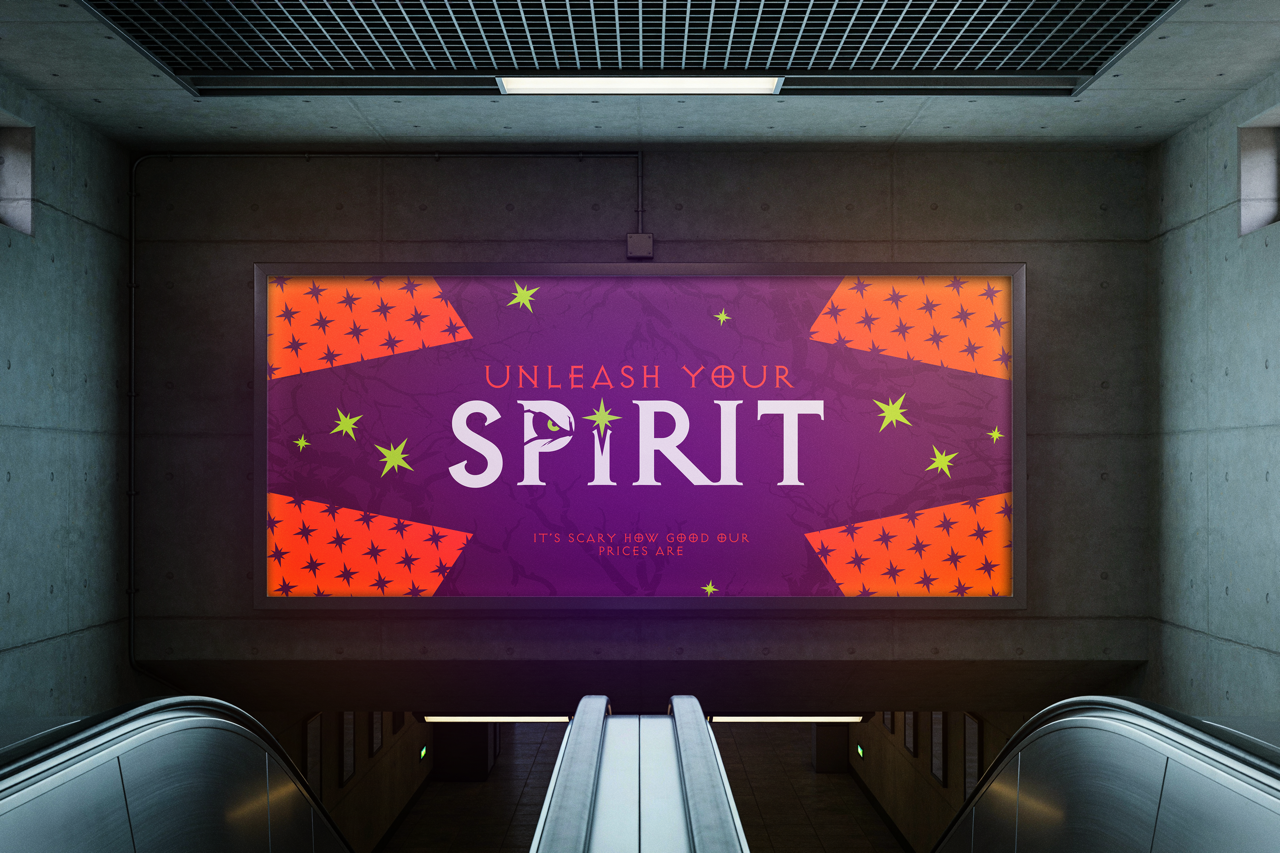 This project reimagines spirit halloween and its identity as a whole. I wanted to bring out a more color specific color schme eot bring in more halloween colors and have a more cohesive logo that mixes up the mascot along with the wording itself. With the pattern of the star being prevalent within its designs and patterns